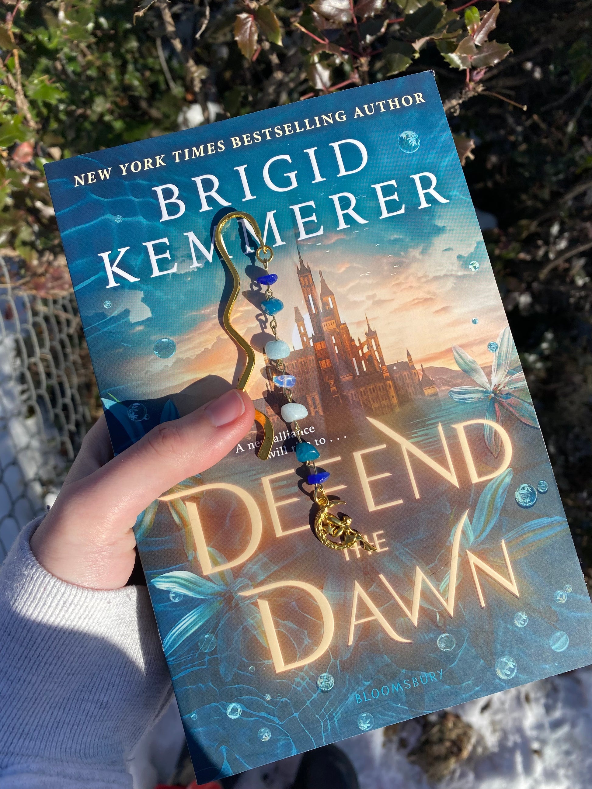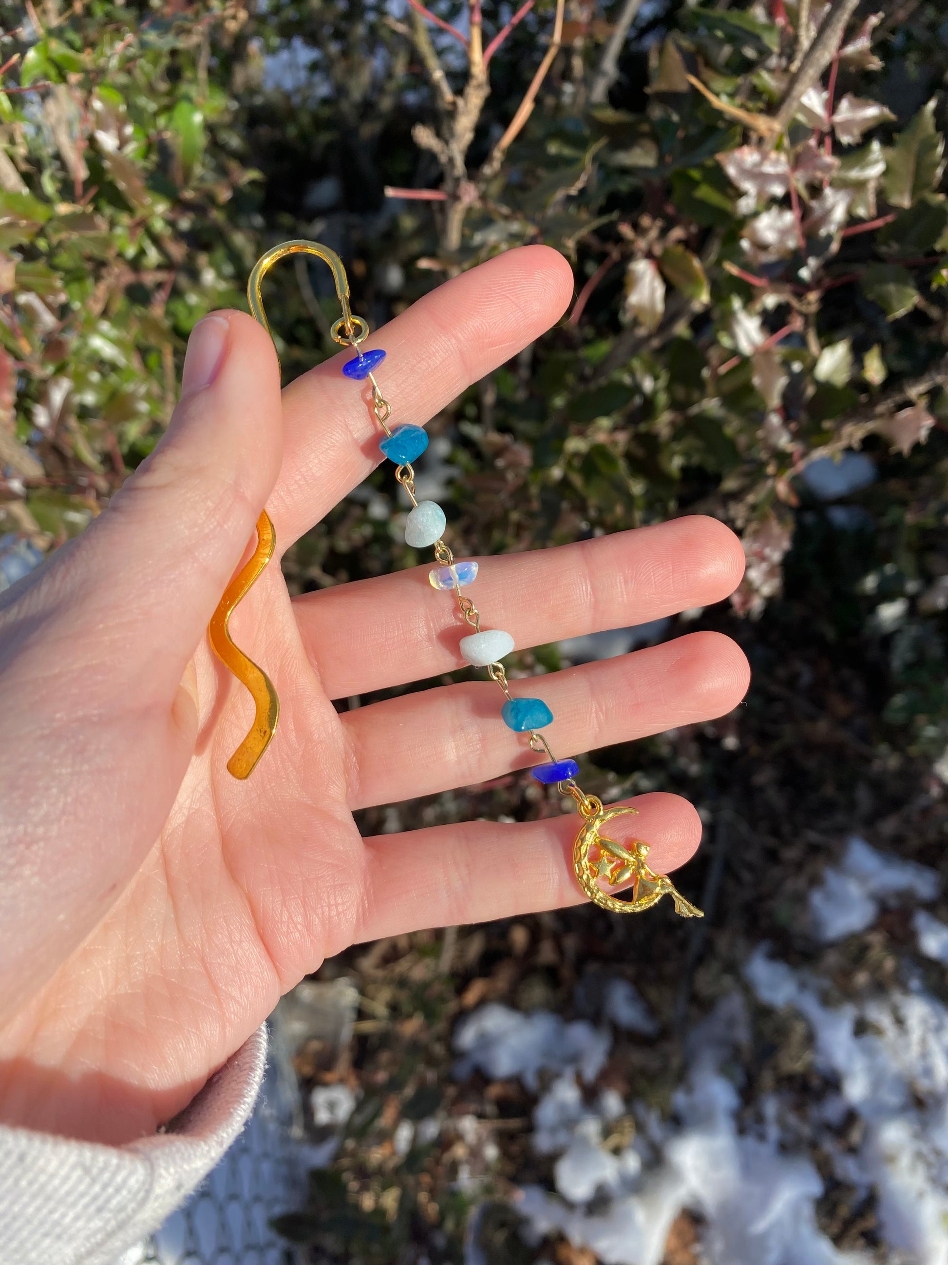 -(1) Gold wavy bookmark with gemstones and a fairy sitting on the moon charm