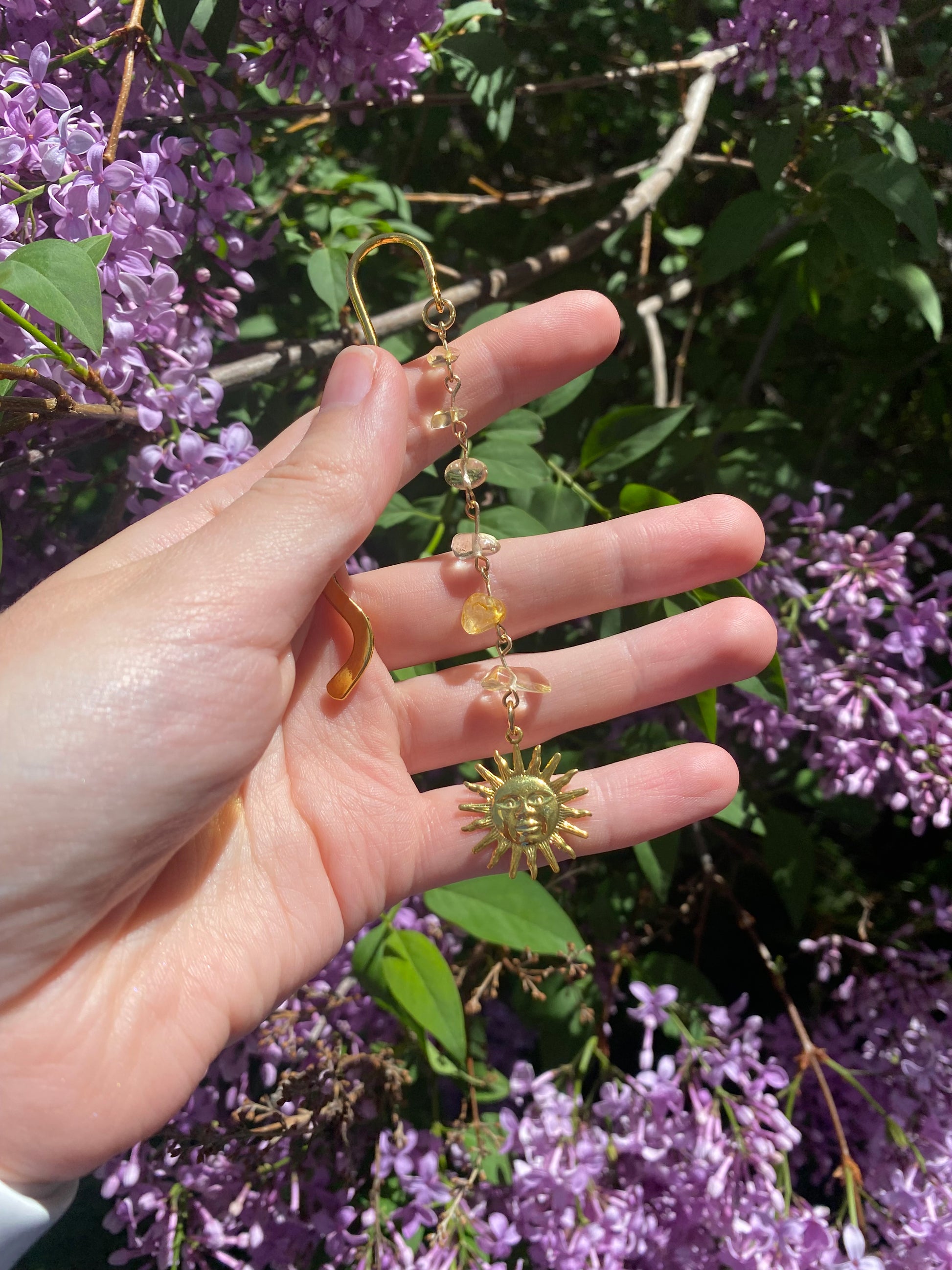 -(1) Gold wavy bookmark with yellow quartz gemstones and a gold sun charm