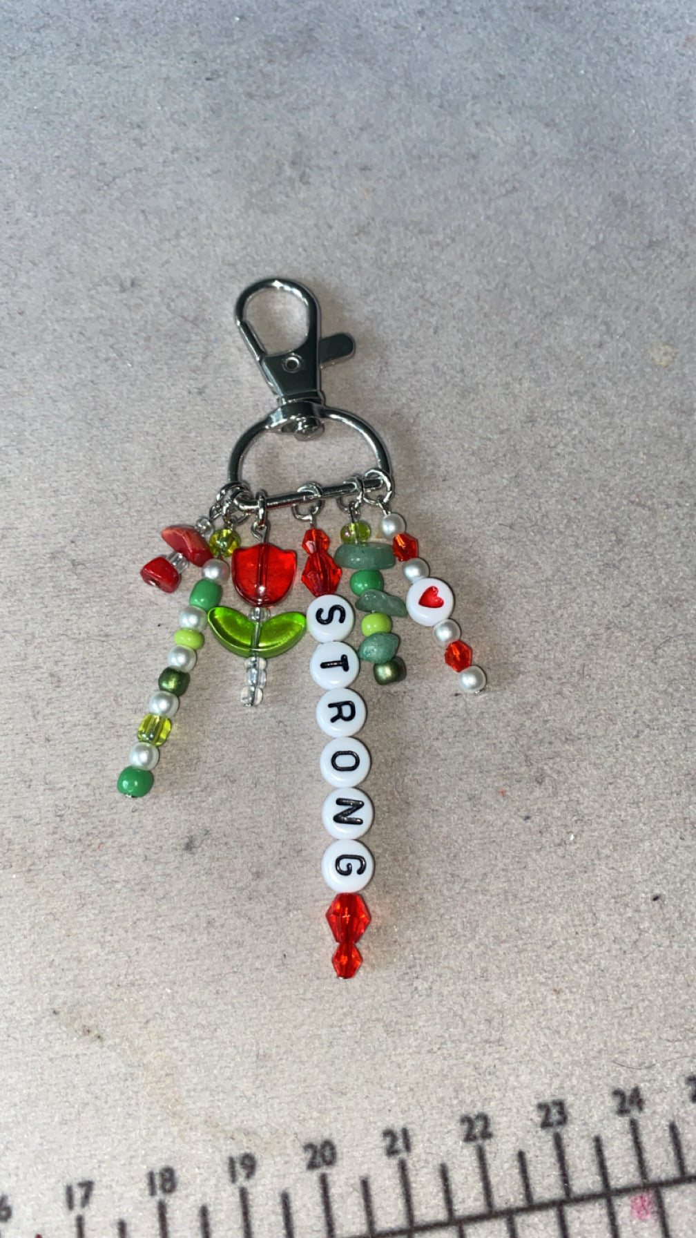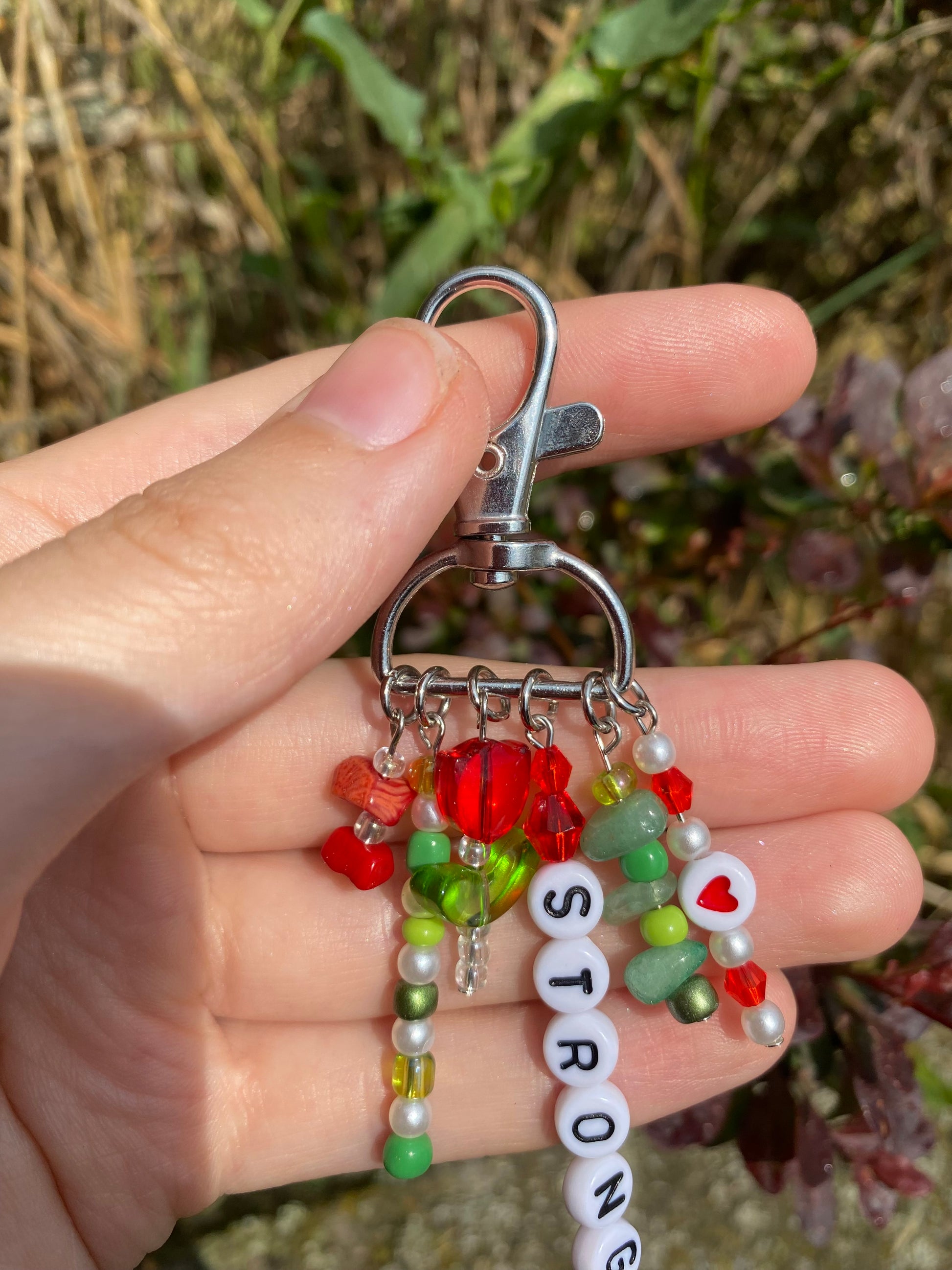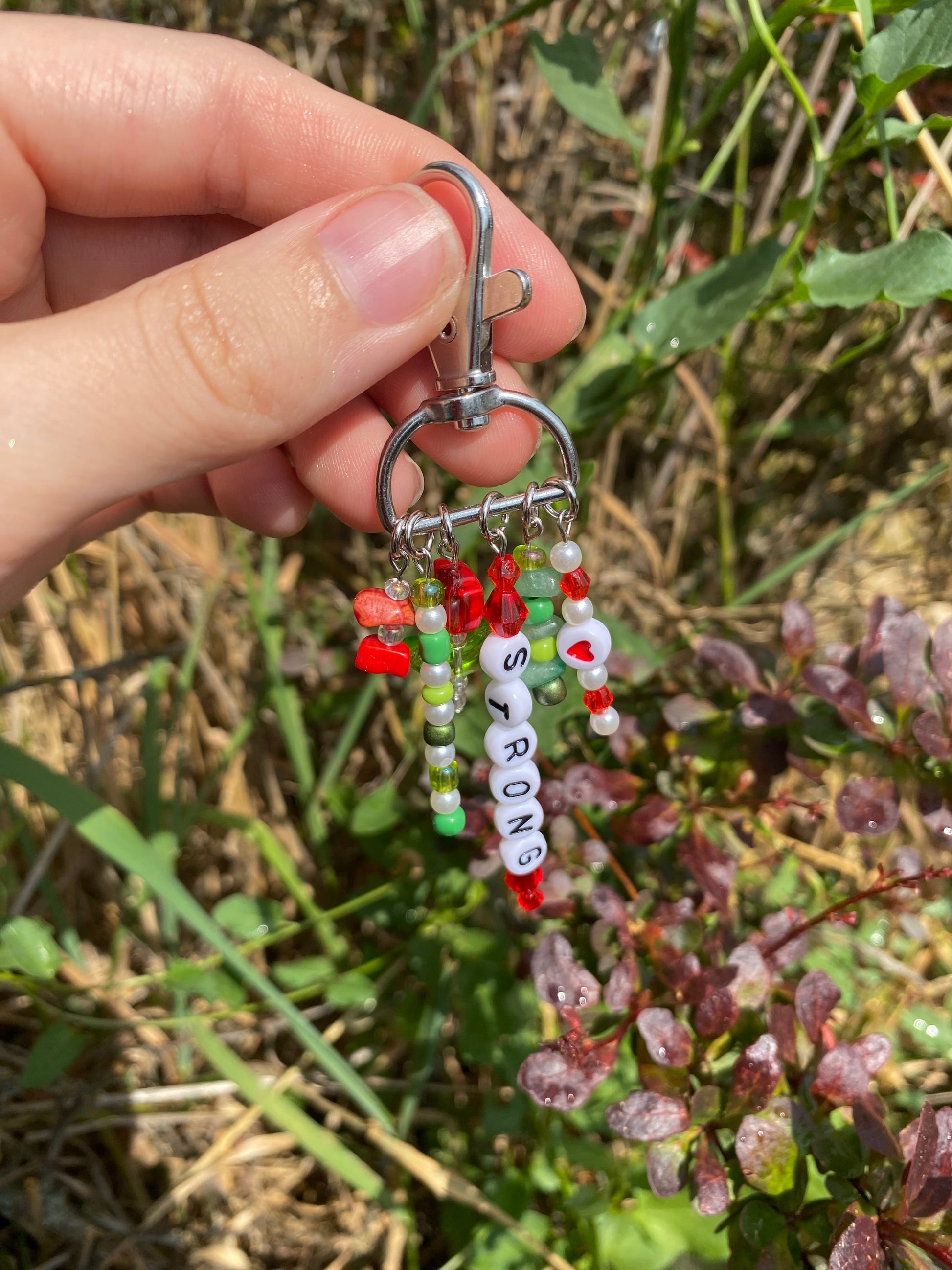 -This keychain is on a 3/4" d-ring silver swivel keychain and has 6 red and green charms dangling from it.