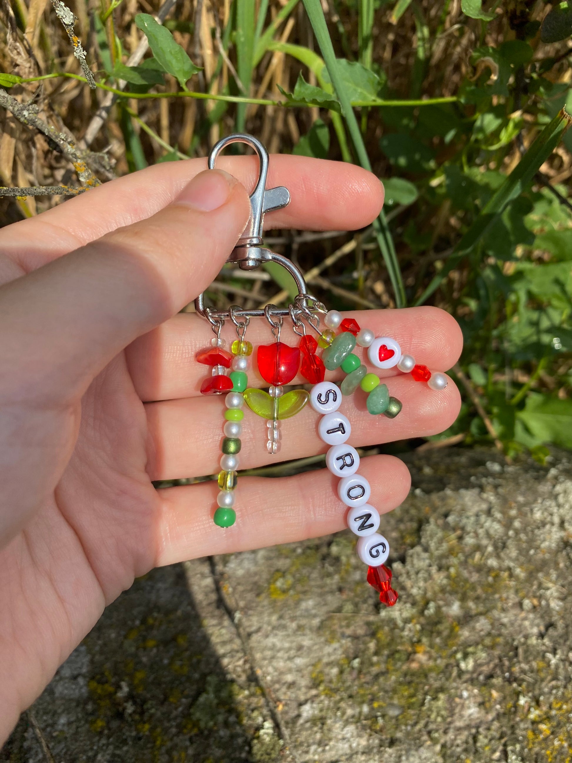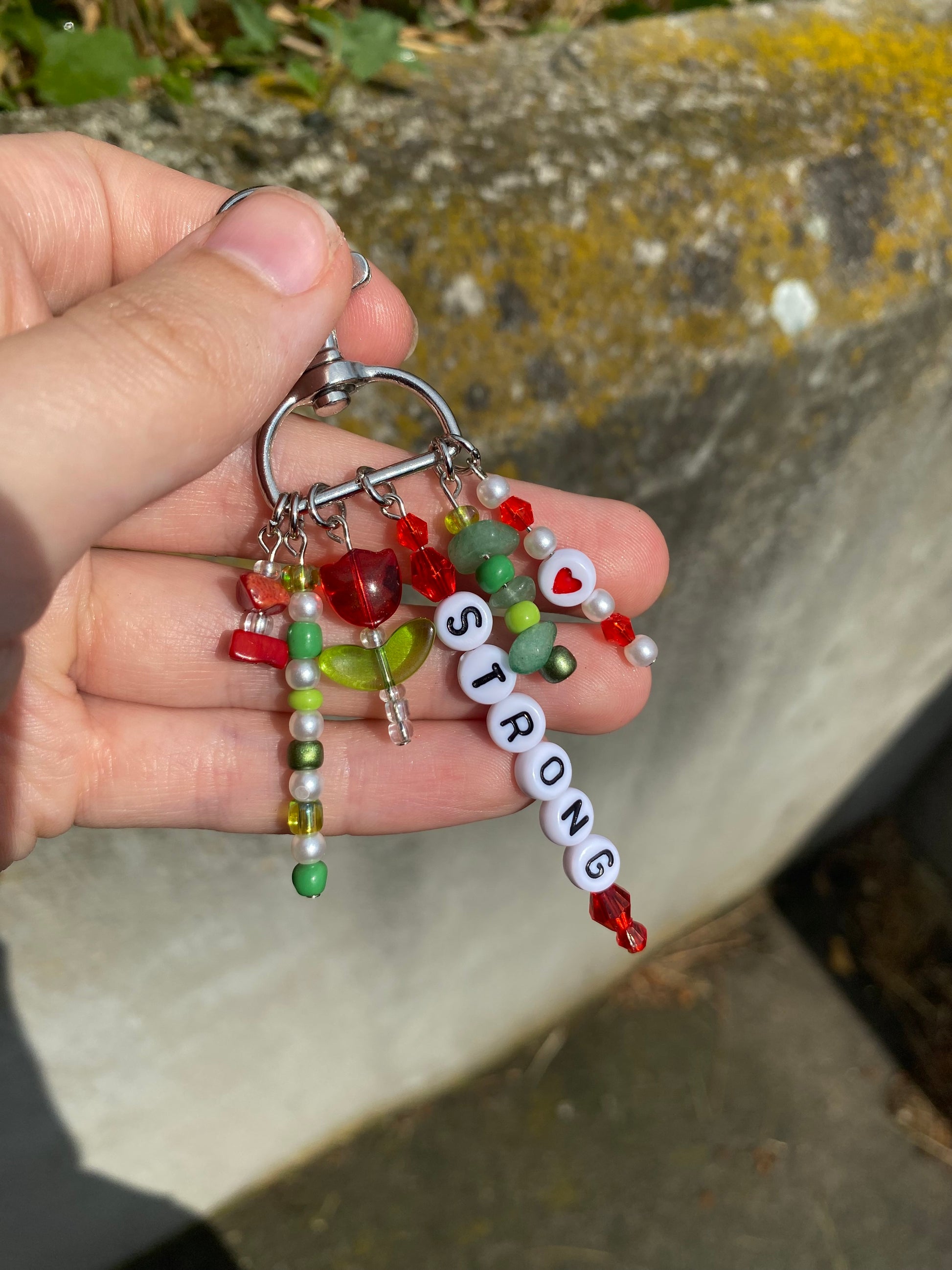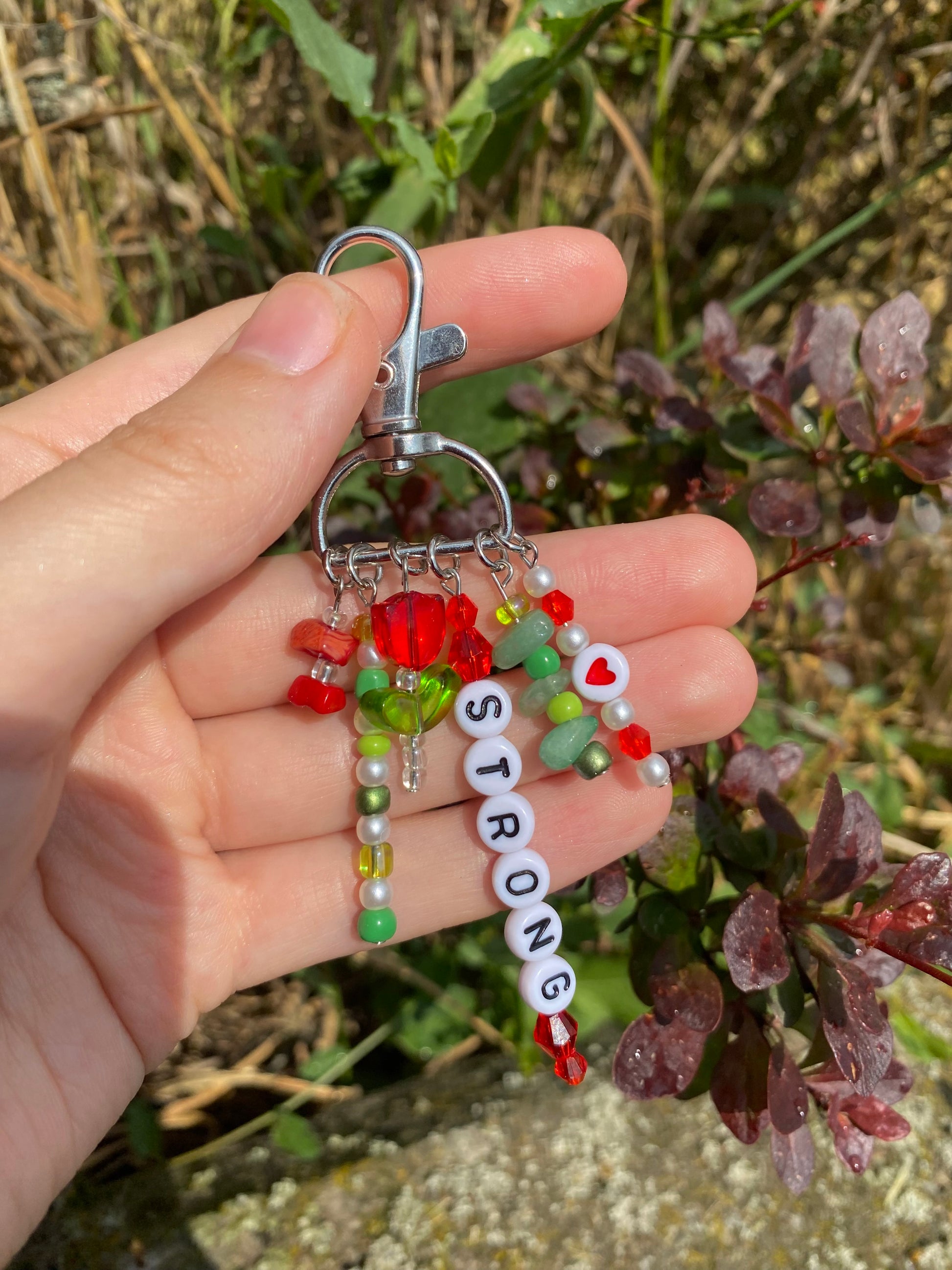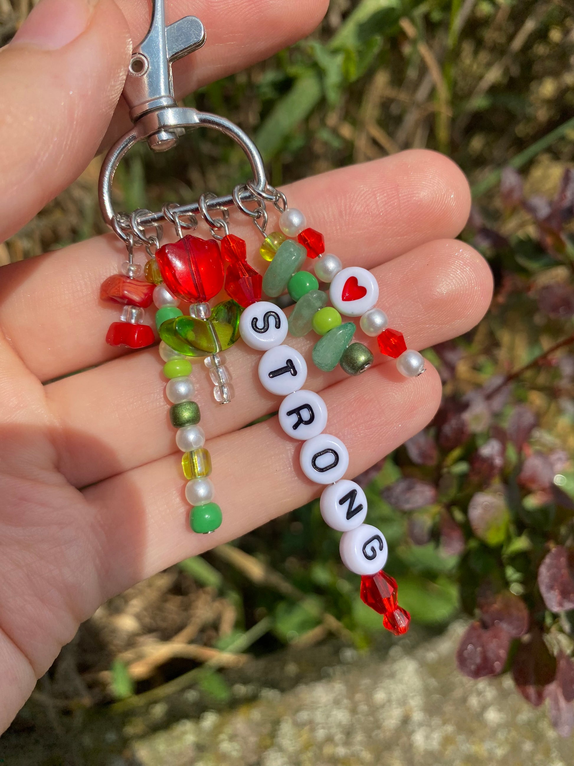 -This keychain is on a 3/4" d-ring silver swivel keychain and has 6 red and green charms dangling from it.